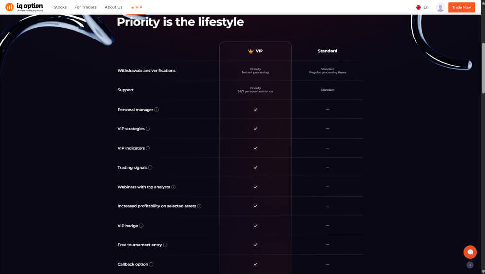 موجَّه للمستثمرين أصحاب الاستثمارات الأكبر والأهداف المُتقدِّمة، إذ يمتاز حساب VIP بالخصائص التالية: